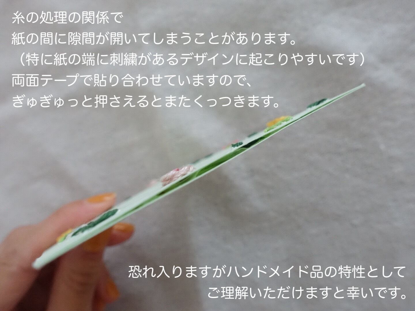 ・糸の処理の関係で、カードの表面にはところどころ紙の浮きや凹凸がございます。文字を書く際はご注意ください。